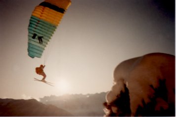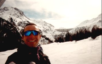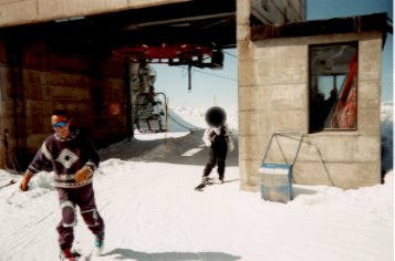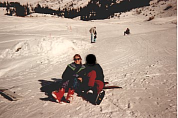Descendre du télésiège : toujours une étape difficile. Yves en plein cours de snowboard.... |